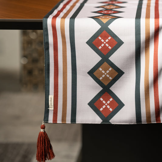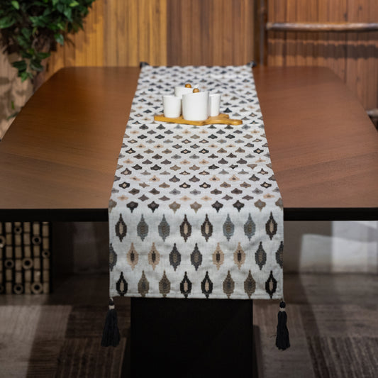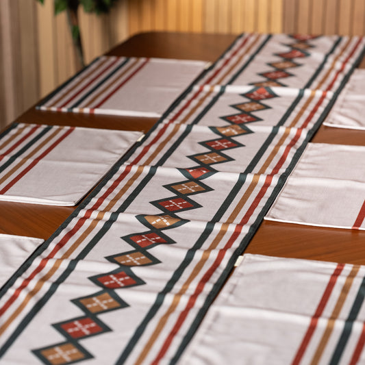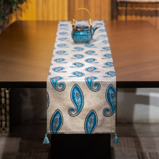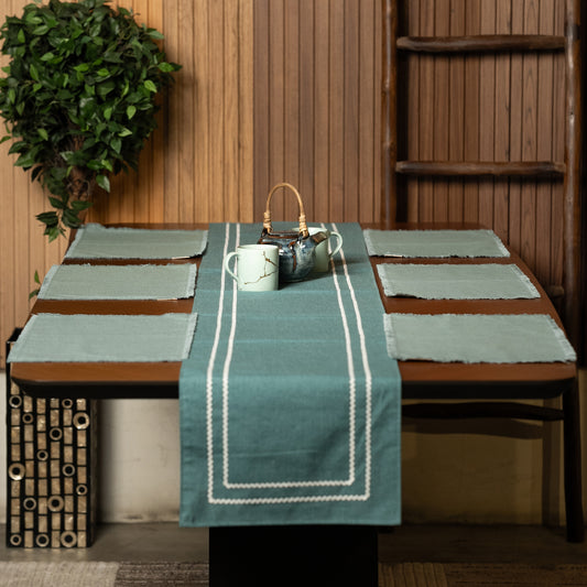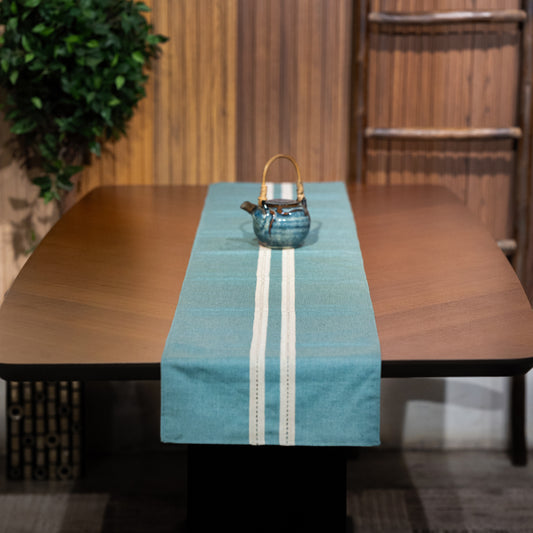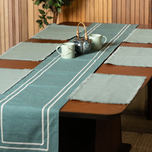 Table runners can be placed either lengthwise down the center of the table or across the width of the table, serving as a placemat for two. When used lengthwise, ensure it is one-third the width of the table with a six-inch drop on each end. For widthwise placement, it should appear slightly narrower