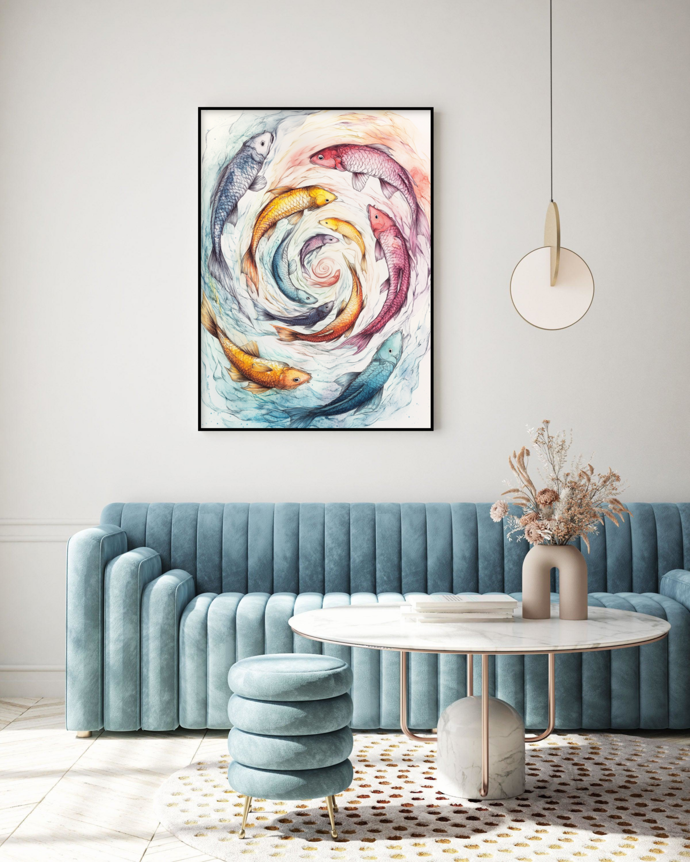 Koi fish swirl in an abstract spiral on a white background, their vibrant watercolor forms creating depth and movement. Soft lighting enhances the pastel hues, capturing the graceful rhythm of nature.